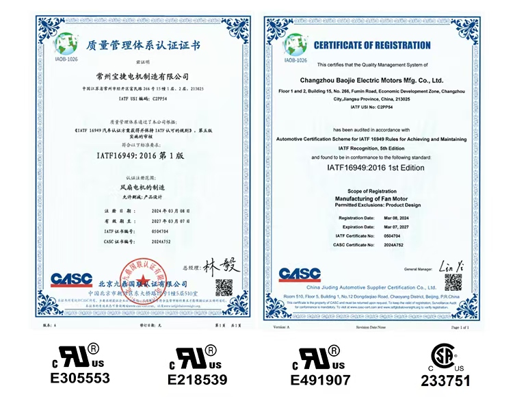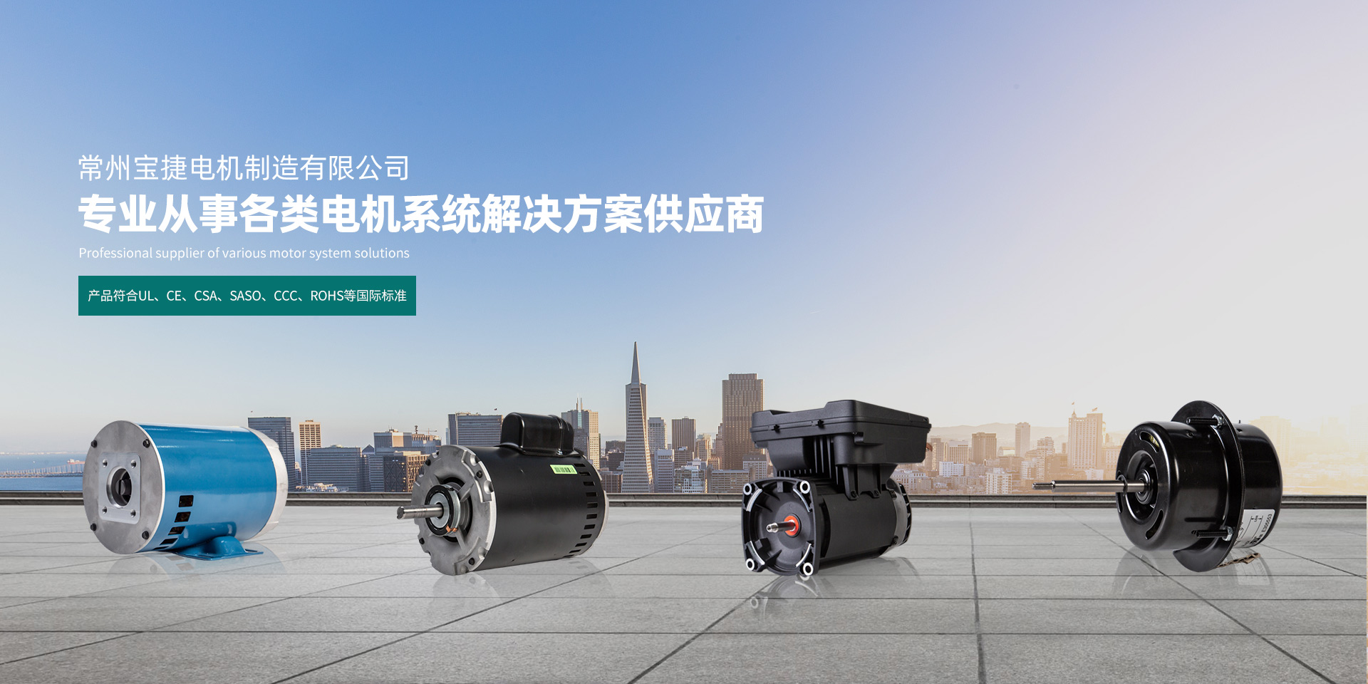 常州寶捷電機制造有限公司,成立于2001年。專業從事各類單相交流電機、高效節能電機及機電一體化產品的設計開發、生產制造、銷售服務的中美合資企業。產品主要應用于各類家用及商用空調器、各類電器及特種移動車輛行業。產品符合UL、CE、CSA、SASO、CCC、ROHS等國際標準,全部出口歐美等國際市場。公司獲得IATF16949:2016質量體系認證,擁有UL認證實驗室,應用SAP精益管理系統,為國內外客戶提供優質的產品和服務!
